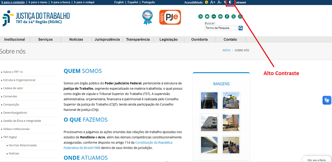 O auto contraste auxilia na leitura de pessoas com baixa visão ou daltonismo. Ao ativar o alto contraste, há uma inversão das cores da página e o aumento de contraste entre elas, como o próprio nome da ferramenta sugere. O ícone utilizado para indicar a disponibilidade da versão de alto contraste na página do TRT14 é representado por um símbolo redondo, formado por metade na cor branca e outra metade na cor preta, e fica localizado na barra de acessibilidade.
