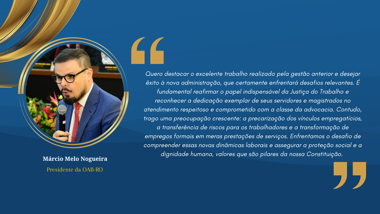 Em uma solenidade prestigiada por autoridades, representantes de instituições parceiras, servidores e servidoras, o Tribunal Regional do Trabalho da 14ª Região (RO/AC) deu posse aos novos dirigentes para o biênio 2025/2026. O evento presencial ocorreu na tarde desta quarta-feira (4), no auditório do TRT-14, em Porto Velho, com transmissão ao vivo pelo canal oficial do Tribunal no YouTube.