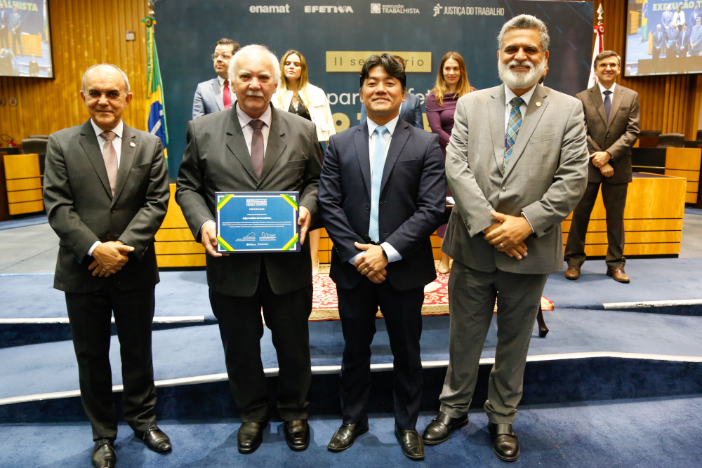 O Conselho Superior da Justiça do Trabalho (CSJT) premiou, nesta terça-feira (14/5), o Tribunal Regional do Trabalho da 14ª Região (RO/AC) pelo desempenho na 13ª edição da Semana Nacional da Execução Trabalhista, realizada no período de 18 a 22 de setembro de 2023. A premiação foi entregue pelo presidente do CSJT e do Tribunal Superior do Trabalho (TST), ministro Lelio Bentes Corrêa, ao presidente do TRT-14, desembargador Osmar J. Barneze, durante o II Seminário Caminhos para a Efetividade da Execução Trabalhista, na sede do TST, em Brasília (DF).