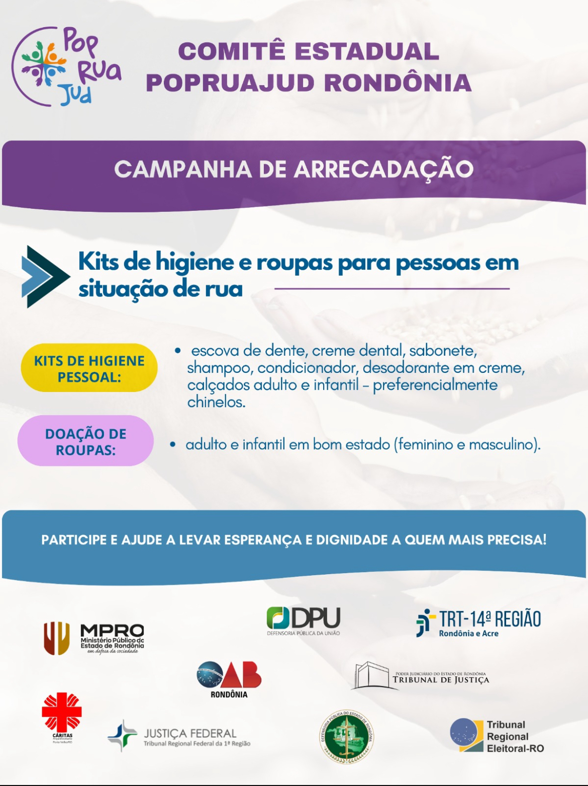Em Porto Velho, a Justiça do Trabalho integra campanha do Comitê Interinstitucional PopRuaJud Rondônia que reúne órgãos judiciários na assistência a pessoas em situação de rua. A iniciativa visa arrecadar kits de higiene pessoal, roupas e calçados para destinação durante os mutirões que estão previstos para acontecer em Porto Velho e Ariquemes.