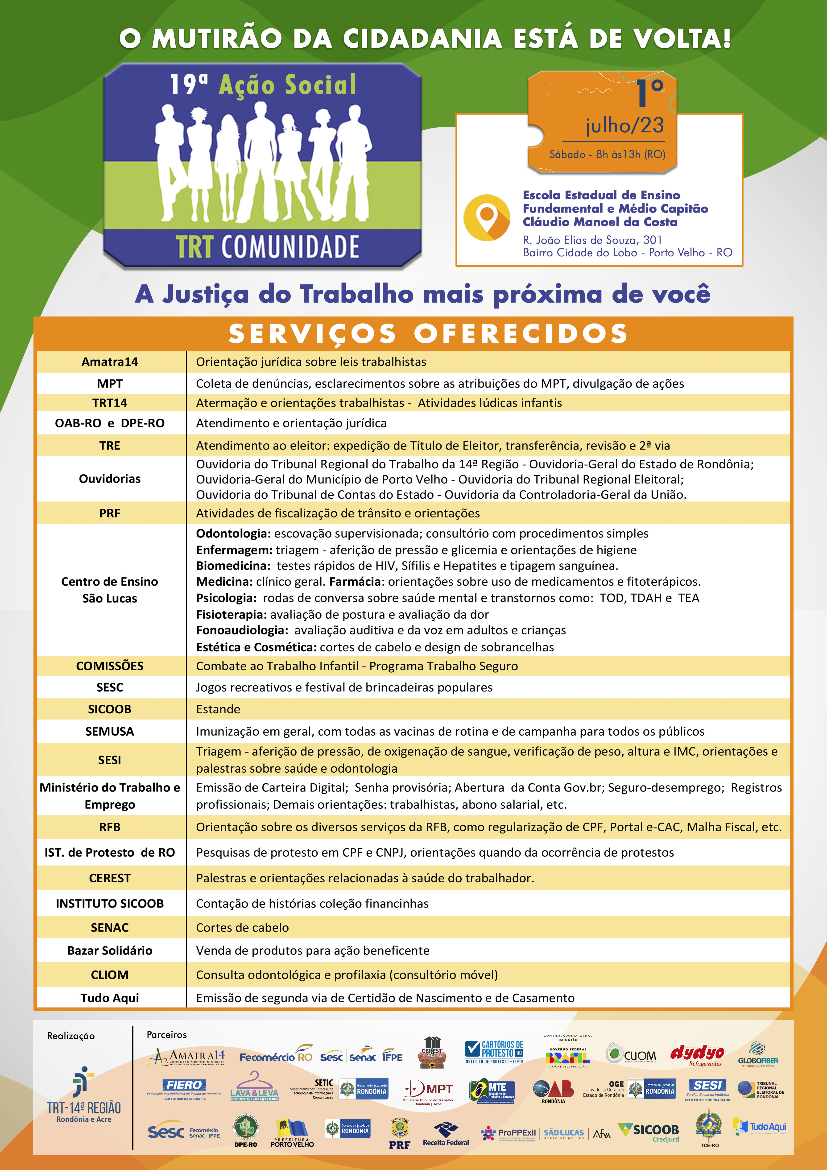 Mais 30 instituições públicas e privadas participam da 19ª edição do “TRT Comunidade - A Justiça do Trabalho mais próxima de você”, a se realizar no próximo dia 1º/7, na zona sul de Porto Velho.