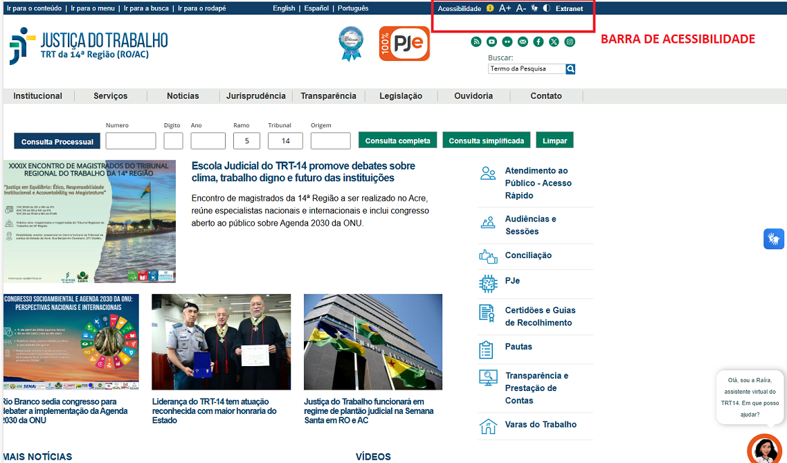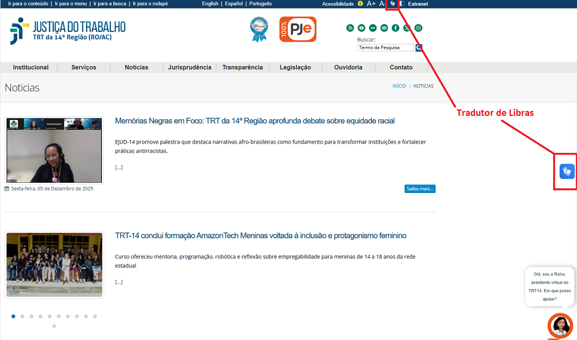 O portal do TRT da 14ª Região está integrado à ferramenta VLibras, programa de computador que permite a tradução automática do conteúdo do site para Linguagem Brasileira de Sinais, sendo compatível com computadores, celulares e tablets. Ao clicar no ícone representado por duas mãos, conforme imagem abaixo, surgirá um intérprete virtual, programado para realizar tradução para Libras, após selecionados os conteúdos que se deseja traduzir.