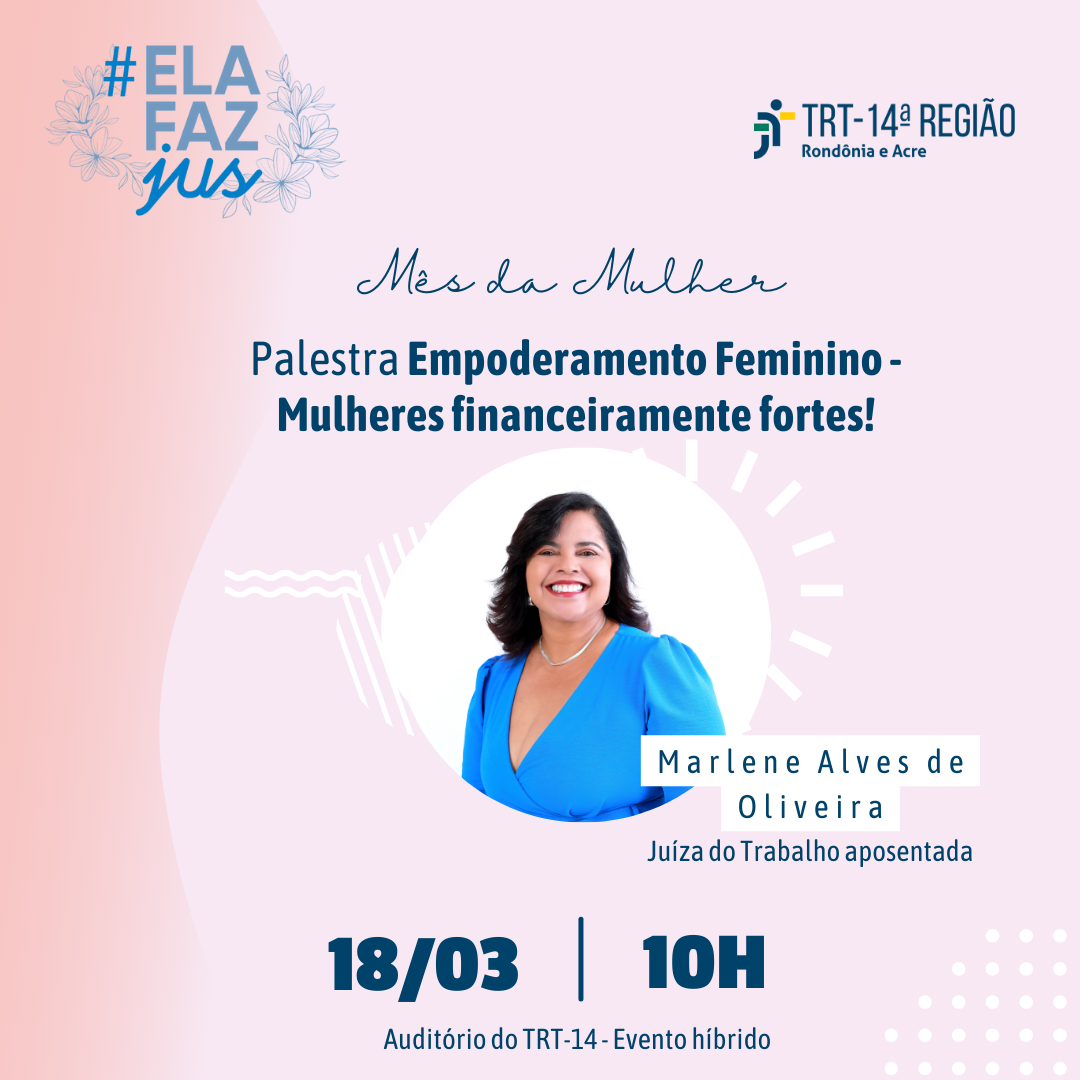 A próxima atividade do Mês das Mulheres será a palestra “Empoderamento Feminino – Mulheres Financeiramente Fortes”, a ser ministrada pela juíza do Trabalho aposentada Marlene Alves de Oliveira. O evento, que acontecerá na próxima terça-feira (18/3), às 10h, no auditório do TRT-14, tratará da importância da independência financeira para as mulheres, fornecendo insights sobre educação e estratégias para uma vida financeira segura e estável.