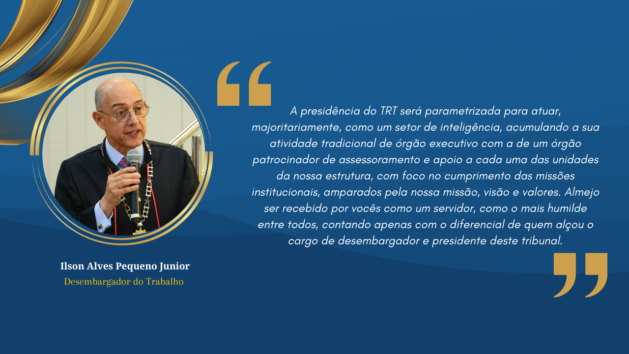 Em seu discurso, o novo dirigente do Tribunal, Ilson Pequeno Junior, destacou como eixo estruturante de sua gestão a inovação, que servirá como parâmetro para a alteração da cultura organizacional, mudança no desenho dos processos de trabalho, com aplicação de novas tecnologias, capacitação dos juízes(as) e servidores(as) e aprimoramento da medição e avaliação de resultados. Destacou, também, um papel colaborativo da Presidência no cumprimento das metas nacionais de desempenho.