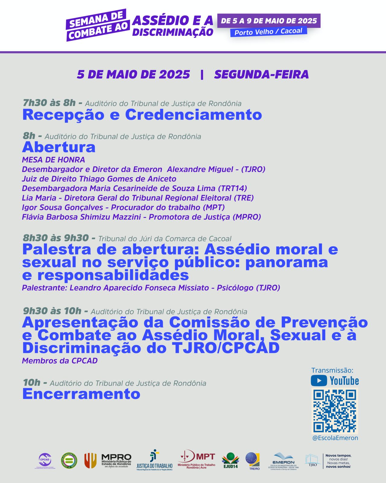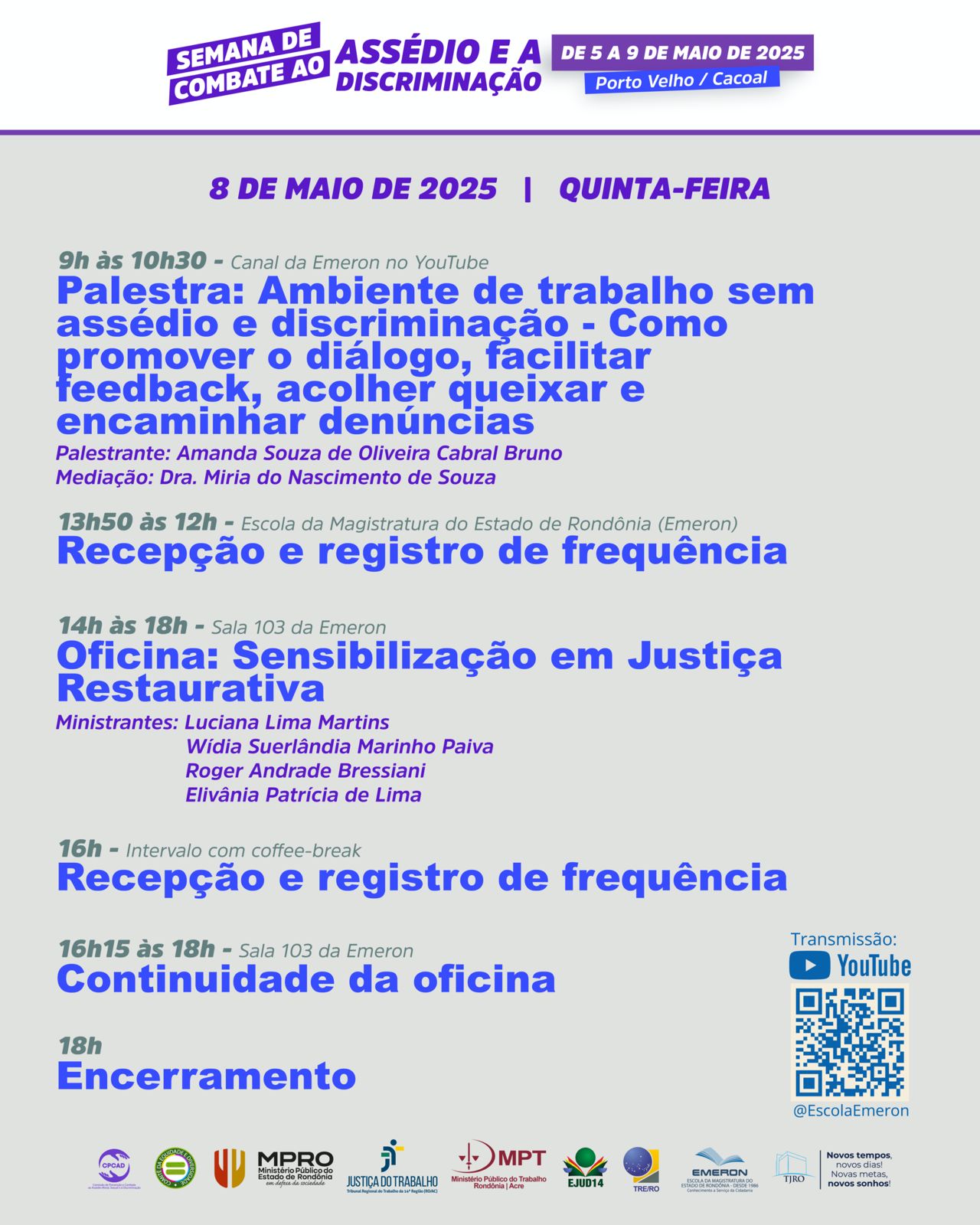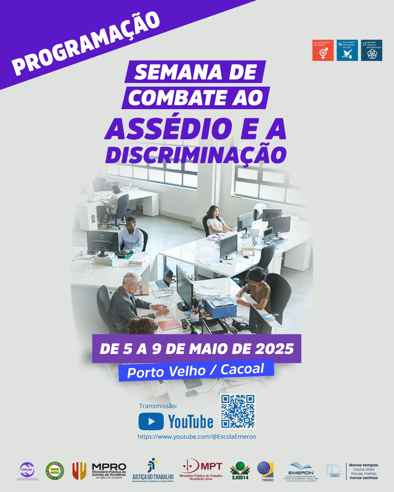 De 5 a 9 de maio acontece a Semana de Combate ao Assédio e à Discriminação com uma programação híbrida de palestras e oficinas voltadas à conscientização e debate do tema. O evento é promovido pelo Tribunal Regional do Trabalho da 14ª Região (RO/AC), em conjunto com o Tribunal de Justiça de Rondônia, Ministério Público de Rondônia, Tribunal Regional Eleitoral de Rondônia e o Ministério Público do Trabalho.