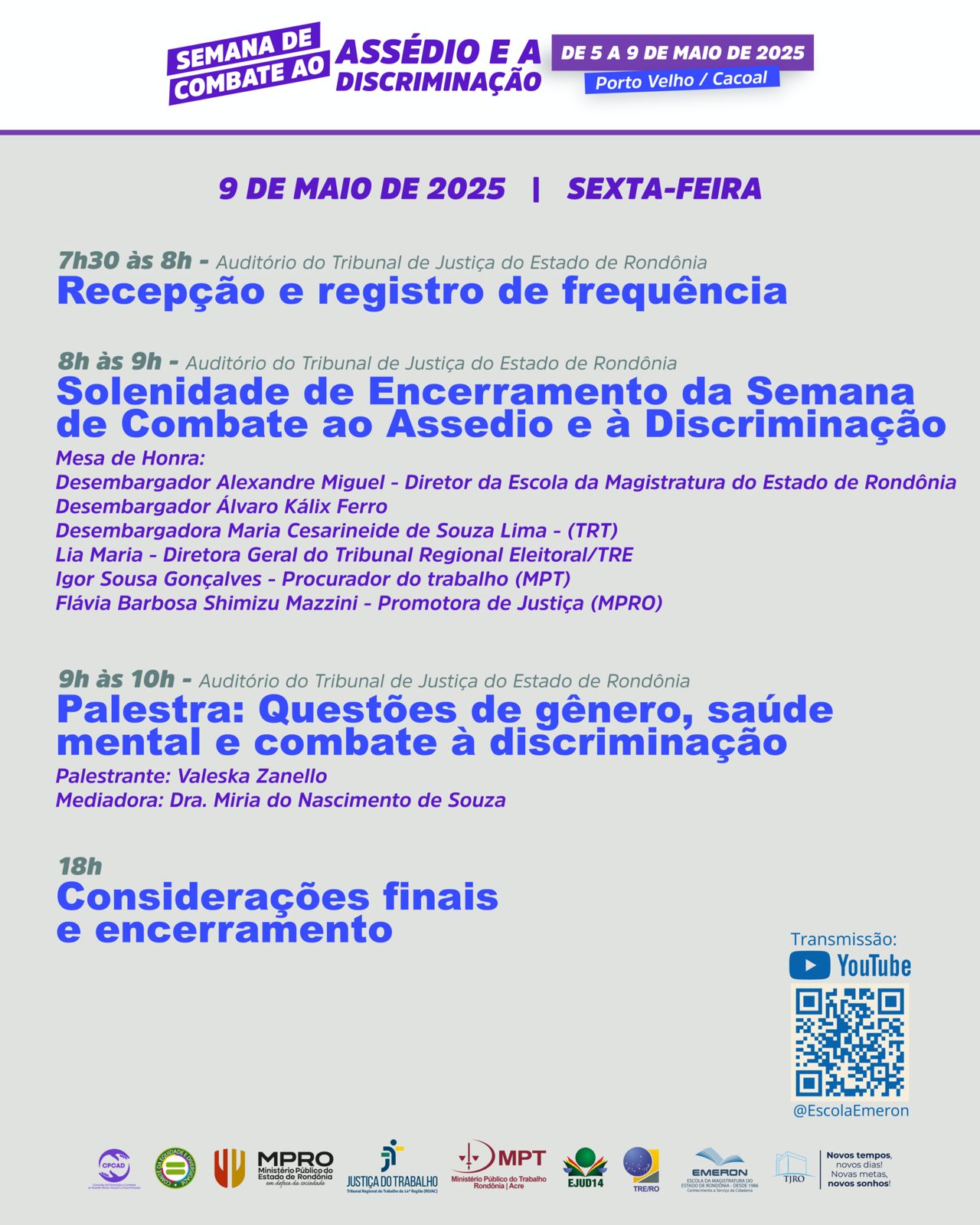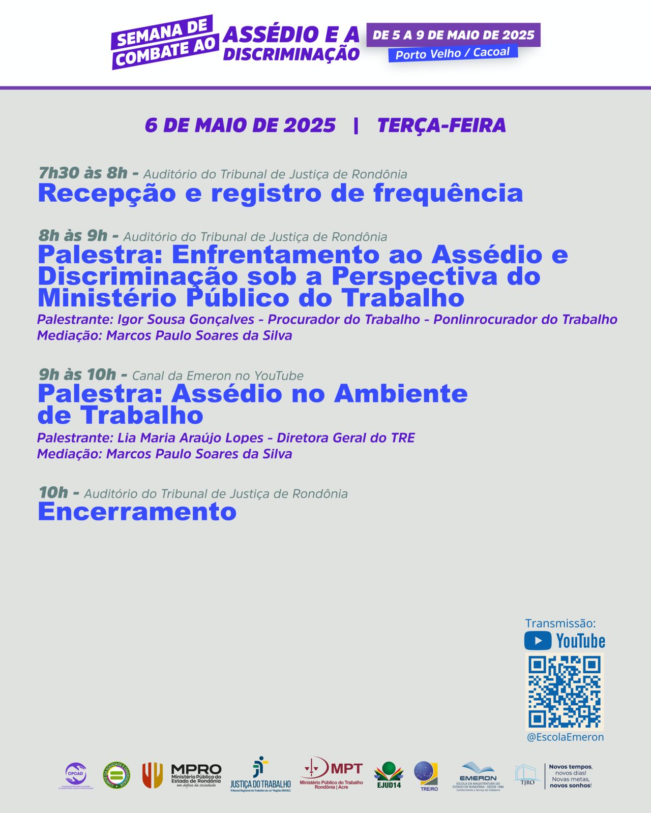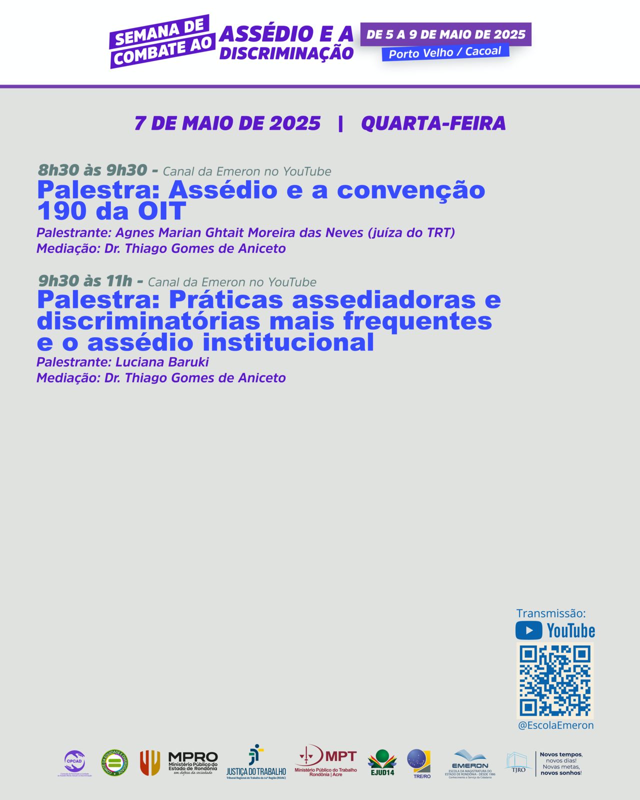 Já no dia 7, a juíza do Trabalho Agnes Marian Ghtait, da 2ª Vara do Trabalho de Porto Velho, ministrará a palestra "Assédio e a Convenção 190 da OIT", das 8h30 às 9h30. A palestra será na modalidade telepresencial e poderá ser assistida diretamente no canal da Escola da Magistratura do Estado de Rondônia (Emeron), no YouTube.