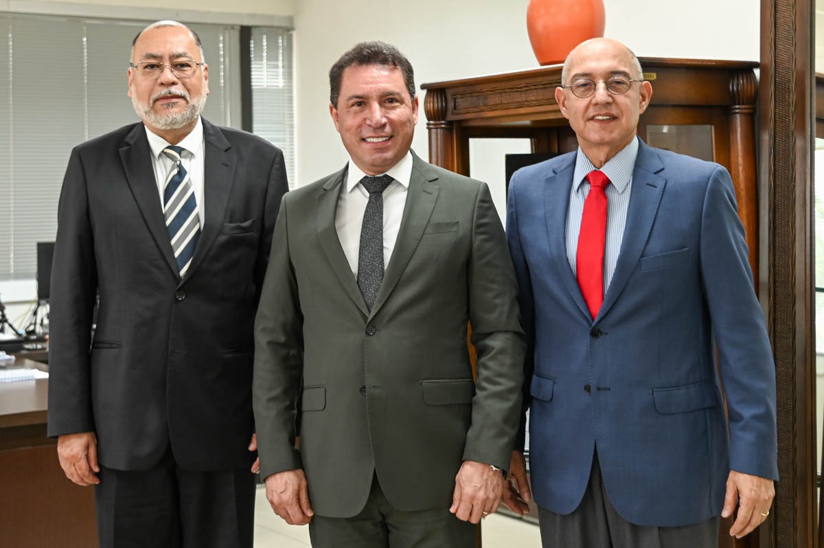 O presidente do TRT-14, desembargador Ilson Alves Pequeno Junior, o vice-presidente e corregedor, desembargador Carlos Augusto Gomes Lôbo, e o secretário-Geral da Presidência, João Bosco Machado de Miranda, foram recebidos pelo presidente do TJAC, Laudivon Nogueira.