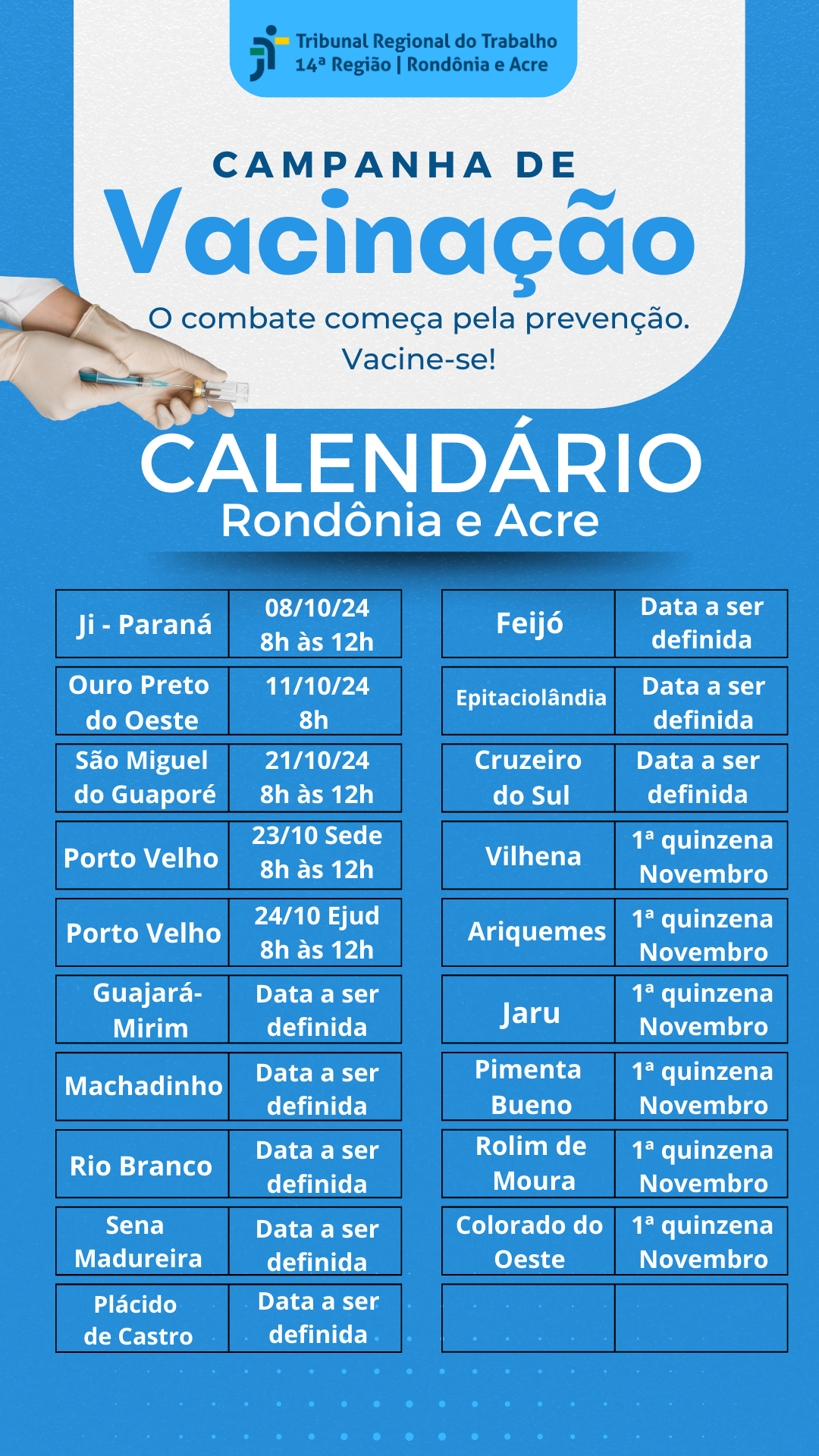 A campanha de vacinação teve início por Buritis, no dia 27 de setembro. Em Porto Velho, a vacinação ocorrerá no dia 23/10/24 na Sede do tribunal e, no dia 24/10/24, na Coordenadoria de Materias e Patrimônio (CMP). “Vale destacar que em todas as cidades onde o TRT-14 conta com unidades, as respectivas Secretarias Municipais de Saúde confirmaram a vacinação, mas a data de algumas será definida de acordo com o calendário geral da campanha nacional e local”, informou o gestor da CAS.