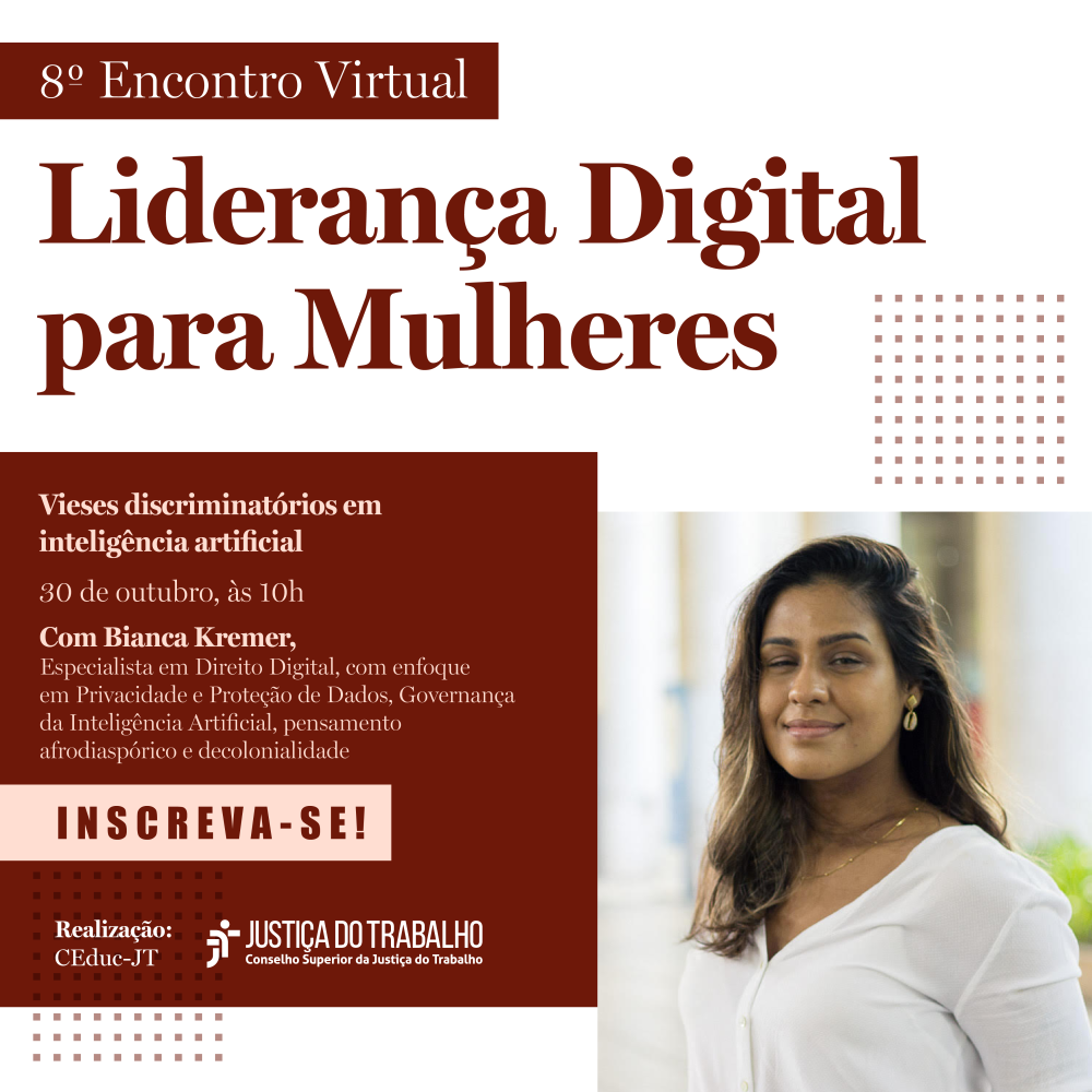 “Vieses discriminatórios em inteligência artificial”. Esse é o tema da 8ª edição do Ciclo de Encontros Virtuais - Liderança Digital para Mulheres. O evento ocorrerá no dia 30 de outubro (segunda-feira), das 10h às 12h, e terá como palestrante Bianca Kremer, pesquisadora em Direito e Tecnologia.