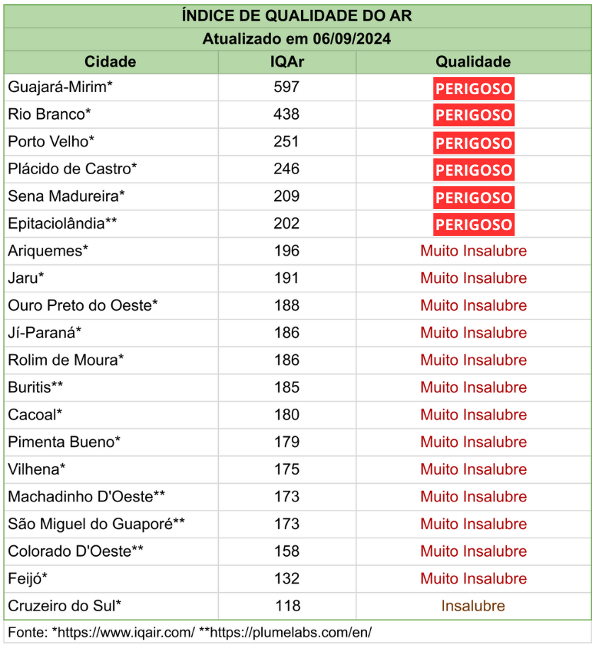 Confira abaixo a tabela que mede o índice de qualidade do ar nas cidades que possuem unidades da Justiça do Trabalho.