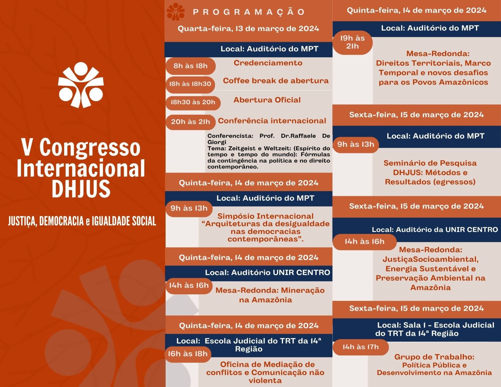 O V Congresso Internacional do Mestrado em Direitos Humanos e Desenvolvimento da Justiça, será realizado nas sedes da Ejud-14, Universidade Federal de Rondônia (Unir - Centro), Ministério Público do Trabalho da 14ª Região (MPT) e Defensoria Pública do Estado de Rondônia (DPE/RO). A iniciativa está sob a coordenação da Unir, DPE/RO, MPT, Tribunal de Justiça do Estado de Rondônia (TJRO) e do Ministério Público do Estado de Rondônia (MP-RO), contando com o apoio da Ejud-14 e da Ordem dos Advogados do Brasil - Seccional Rondônia.