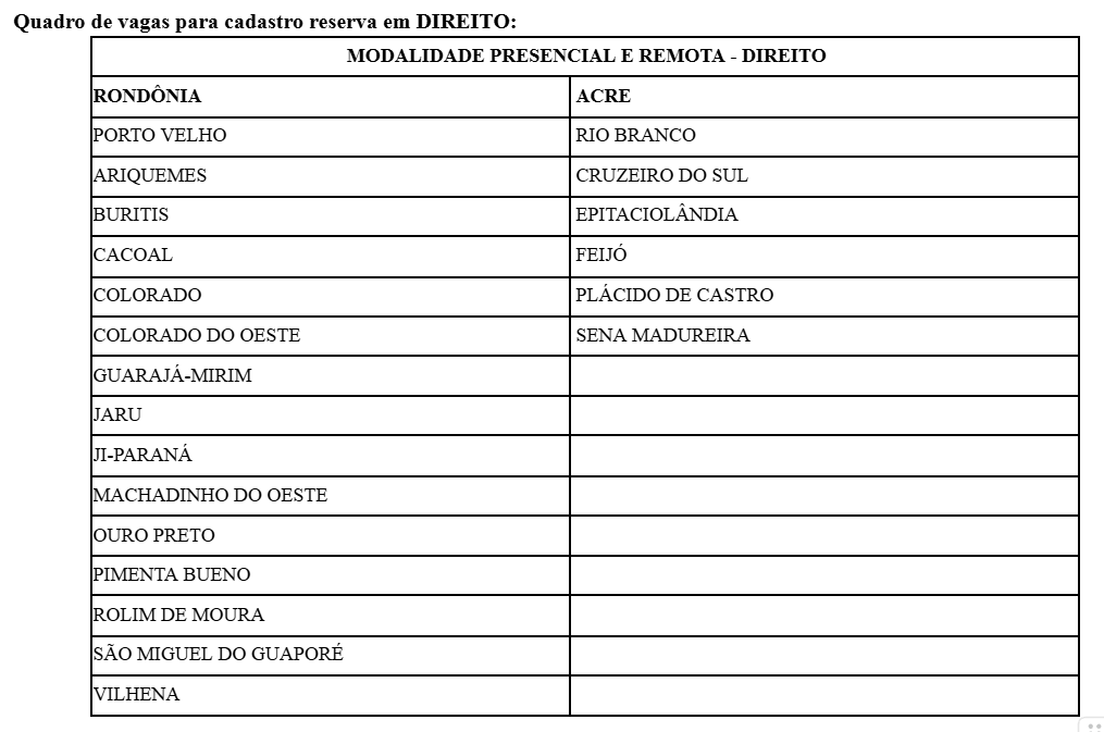 - Direito: Vagas presenciais e remotas para diversas cidades de Rondônia e Acre;