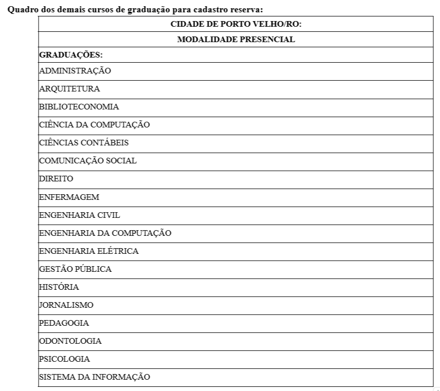 - Demais graduações: Vagas presenciais em Porto Velho/RO, conforme vagas disponíveis no edital.