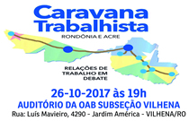 O Tribunal Regional do Trabalho da 14ª Região (TRT14), por meio da Escola Judicial, em parceria com a Ordem dos Advogados do Brasil - Seccional Rondônia (OAB/RO) e a Associação Rondoniense dos Advogados Trabalhista (Aronatra), realiza, na próxima quinta-feira (26), mais uma edição da 'Caravana Trabalhista RO/AC: Relações de Trabalho em Debate', na cidade de Vilhena, Cone Sul do Estado de Rondônia na Subseção da OAB local. [...]