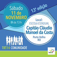 O Tribunal Regional do Trabalho da 14ª Região (TRT14) vai realizar no dia 11 de novembro (sábado) o projeto de responsabilidade socioambiental 'TRT Comunidade', que visa atender a sociedade da zona sul de Porto Velho. A ação vai acontecer das 8h às 13h, na Escola Estadual Capitão Cláudio Manoel da Costa, localizada rua João Elias de Souza, 301 - Cidade do Lobo. [...]