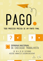 De 18 a 22 de setembro o Conselho Superior da Justiça do Trabalho (CSJT) promove em todo o país a sétima edição da Semana Nacional da Execução Trabalhista. Com o slogan, "Todo processo precisa de um ponto final", a iniciativa é um esforço concentrado da Justiça do Trabalho para solucionar processos com dívidas trabalhistas em fase de execução, onde existe a condenação, mas que a decisão judicial ainda não foi cumprida pelo devedor. [...]